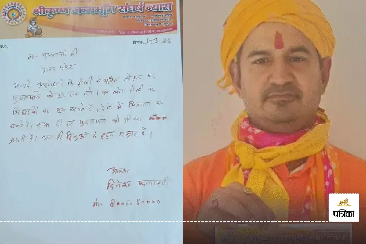 Ban on Muslims in Mathura Holi: होली के त्योहार पर श्री कृष्ण जन्मभूमि ट्रस्ट के अध्यक्ष दिनेश शर्मा ने उत्तर प्रदेश के मुख्यमंत्री योगी आदित्यनाथ को पत्र लिखा है। मीडिया रिपोर्ट्स के मुताबिक ये पत्र उन्होंने खून से लिखा है। पत्र में दिनेश शर्मा ने ब्रज में मुसलमानों की एंट्री पर बैन लगाने की बात कही है।