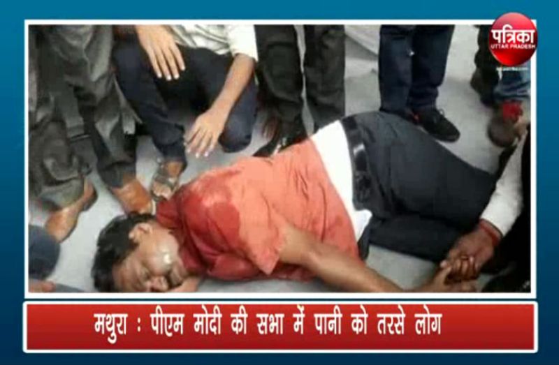 दरअसल प्लास्टिक और पॉलीथिन मुक्त भारत अभियान की पीएम ने यहां से शुरुआत की लिहाजा लोगों को पीने के पानी के लिए सभास्थल पर न तो पानी की बोतल ही नसीब हुई और ना ही पानी की थैली। पानी न मिलने कारण काफी समय से पीएम को कवर कर रहा एक कैमरामैन भी डिहाइड्रेशन का शिकार हो गया और करीब 6-7 फुट ऊंचाई से गिर गया। जो पत्रकार घायल हुए हैं उनका नाम सुनील सक्सेना है जो दूर दर्शन दिल्ली से यहां पीएम के कार्यक्रम को कवर करने टीम के साथ आए थे। वहीं जब प्रधानमंत्री ने पत्रकार के गिर जाने के बाद मंच से ही अपनी मेडिकल टीम को तुरंत पत्रकार की मदद करने के लिए भेजा। कैमरामैन सुनील को करीब एक घंटे बाद होश आया। उन्हें मथुरा के जिल अस्पताल में भर्ती कराया गया।