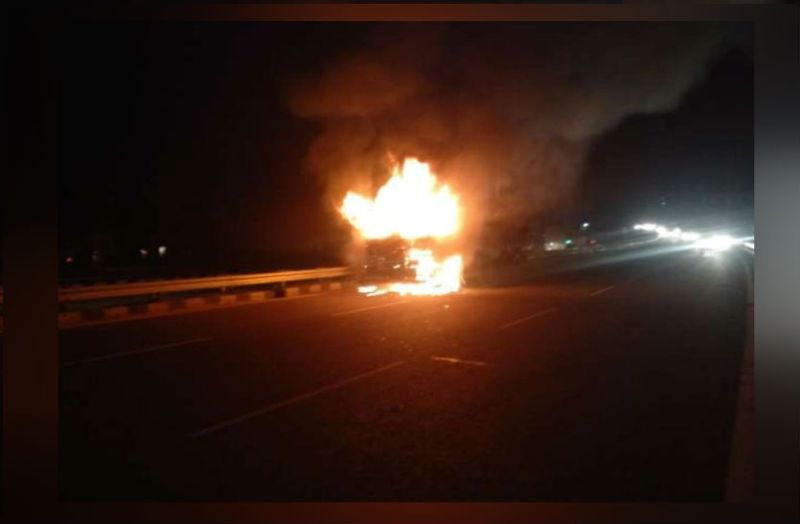 मथुरा। मथुरा में चौमुहां गांव के पास आगरा-दिल्ली राजमार्ग पर सोमवार शाम को ऐसा हादसा हुआ कि प्रत्यक्षदर्शियों की सांसें थम गईं। शाम करीब साढ़े छह बजे मथुरा से दिल्ली की ओर जा रहेे ट्रक के नीचे अचानक एक बाइक आ गई। जोर का धमाका हुआ और बाइक में आग लग गई। कुछ ही देर में आग ने ट्रक को भी अपने आगोश में ले लिया और देखते ही देखते पूरा ट्रक धूं धूं करके जलने लगा।