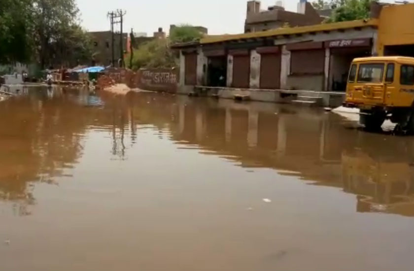 जल निकासी की व्यवस्था न होने के कारण सड़क बनी तालाब, घरों तक पहुंचा पानी
