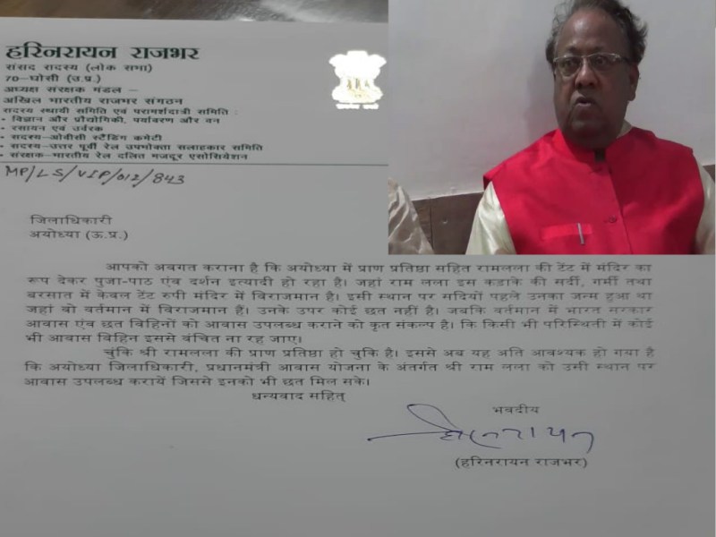 मऊ. यूपी के मऊ से बीजेपी सांसद हरिनारायण राजभर अक्सर अपने बयानों से सुर्खियों में बने रहते हैं। हरिनारायण राजभर ने इस बार पत्र लिखकर मांग की है कि अयोध्या में भगवान राम रामलला जो टेन्ट में विराजमान है और कड़ाके की ठंड के कारण भगवान राम को ठंड लग रही है इसलिए भगवाम राम की समस्याओं को देखते हुए उन्हे जिले के जिलाधिकारी और मुख्य विकास अधिकारी पीएम आवास को उपलब्ध कराने का काम करें।