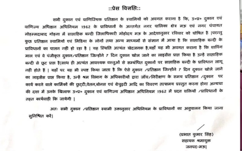 Mau News: मऊ जिले के सहायक श्रमायुक्त प्रभात कुमार सिंह ने सभी दुकान और प्रतिष्ठान स्वामियों से उत्तर प्रदेश दुकान एवं वाणिज्य अधिष्ठान अधिनियम, 1962 के नियमों का पालन करने की अपील की है। उन्होंने बताया कि नगर पालिका क्षेत्र मऊ और नगर पंचायत मोहम्मदाबाद गोहना में साप्ताहिक बंदी का दिन रविवार तय है।