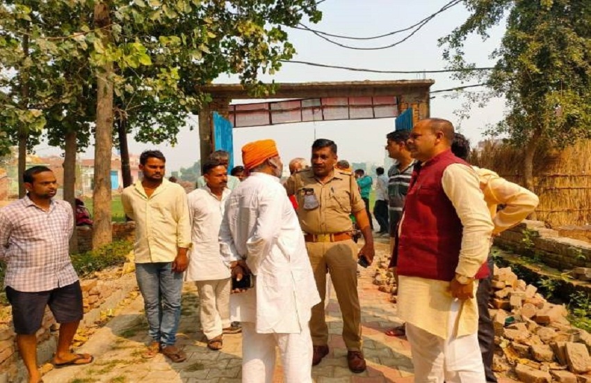 धार्मिक स्थल पर चाेरी की घटना की जांच करती पुलिस और इकट्ठा श्रद्धालु