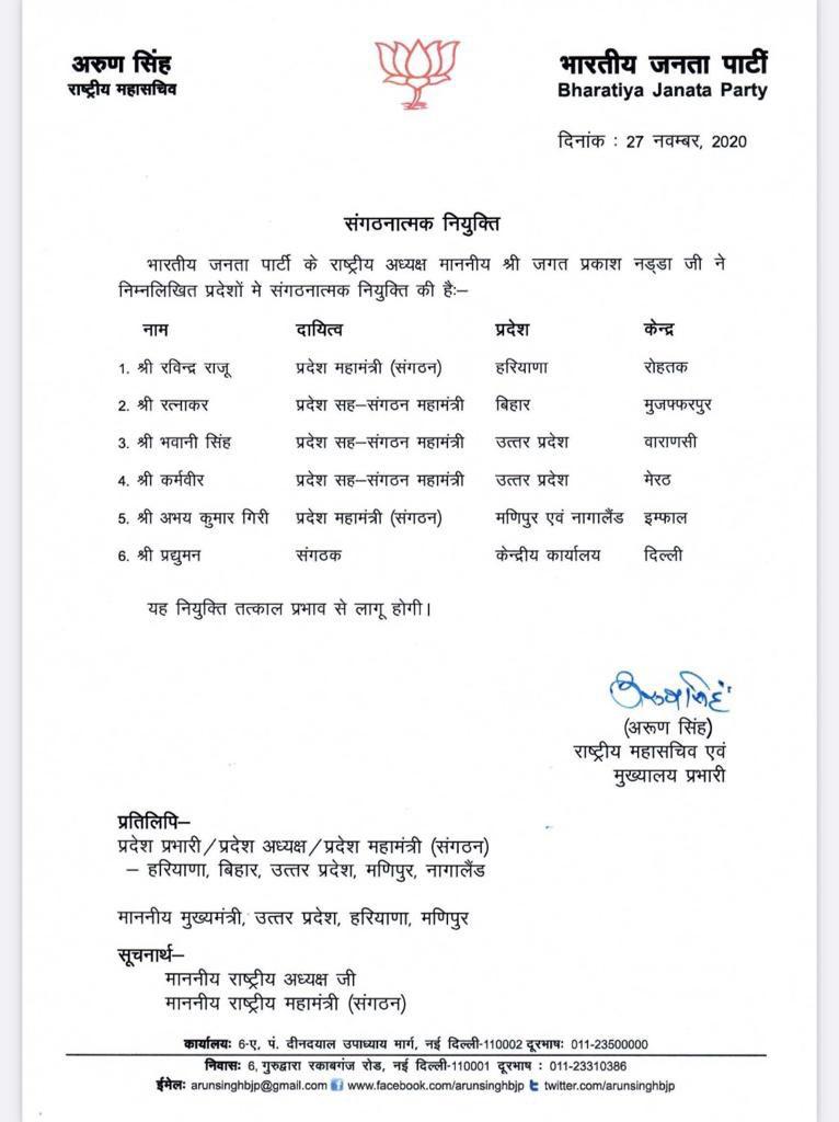 इनमें एक वाराणसी और दूसरा मेरठ है। वाराणसी से भवानी सिंह को प्रदेश में सहसंगठन मंत्री बनाया गया है तो मेरठ से कर्मवीर सिंह को जिम्मेदारी दी गई है। इसके अलावा भाजपा ने कई अन्य प्रदेशों में भी संगठनात्मक नियुक्ति की है। रविंद्र राजू को हरियाणा प्रदेश का संगठन महामंत्री बनाया गया है। बिहार प्रदेश का सहसंगठन मंत्री रत्नाकर को और प्रधुमन को दिल्ली प्रदेश का संगठन मंत्री बनाया गया है। बता दें कि उत्तर प्रदेश में भाजपा के संगठन मंत्री सुनील बंसल हैं। संगठन मंत्री को प्रदेश में मजबूती देने के लिए ही उनके साथ दो सहसंगठन मंत्रियों को आगामी चुनाव की तैयारियों में मजबूती से उतरने के लिए जिम्मेदारी सौंपी गई है।