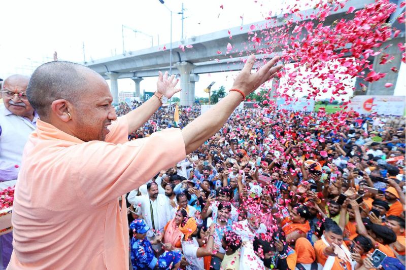 मेरठ में कांवड़ियों पर पुष्प वर्षा करते मुख्यमंत्री योगी आदित्यनाथ।