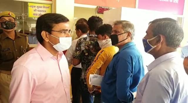 आरटीओ कार्यालय में माैजूद लाेगाें से सरकारी फीस के बारे में पता करते कमिश्नर