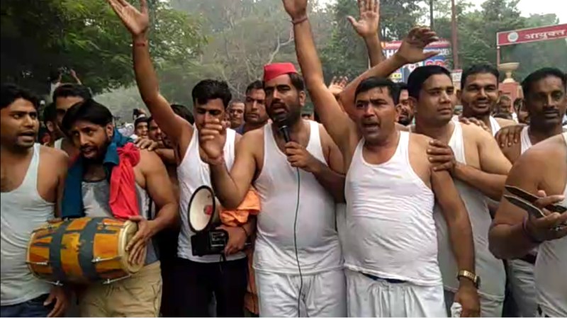 शनिवार से चल रहे किसानों के धरने के दौरान एक समान मुआवजे की मांग करते हुए किसानों ने अर्ध नग्न होकर नारेबाजी की। इस दौरान किसान चौधरी चरण सिंह पार्क के चारों ओर पैदल चलकर चौराहे पर पहुंचे और प्रदर्शन किया। प्रदर्शन के दौरान सपा नेता अतुल प्रधान ने कहा कि प्रशासन किसानों के हक के साथ खिलवाड़ न करें। इसके अंजाम बदतर हो सकते हैं। उन्होंने कहा कि कई वर्षों से लोगों के मुआवजे, आबादी के प्लॉट व दूसरे मुद्दे अटके हुए हैं। कोर्ट के आदेश के बाद प्रशासन उनका निस्तारण नहीं कर रही है। ऊपर से लोगों के घर भी तोडऩे शुरू कर दिए हैं। उन्होंने कहा कि यह बिल्कुल बर्दाश्त नहीं किया जाएगा। अगर प्रशासन किसानों के मुद्दों का निस्तारण नहीं कर सकती तो उसे किसी भी प्रकार की कार्रवाई करने का कोई अधिकार नहीं है। पहले प्रशासन ये बताए किस कानून के तहत आबादी की जमीन पर कार्रवाई की जा रही है। किसानों को एक समान मुआवजा क्यों नहीं दिया जा रहा है।