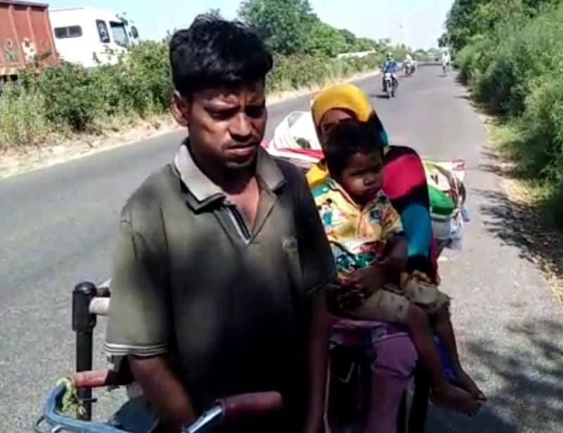 रास्ते में किसी तरह की कोई मदद नहीं मिली। गांव वालों ने जरूर उसकी मदद की। जहां भी जरूरत पड़ती है गांव वालों से खाना बनाने के लिए आटा और अन्य सामग्री ले लेता है और कहीं भी सड़क के किनारे खाना बनाकर अपना और बच्चों का पेट भर लेता है। छोटा कहता है कि मार्च माह में अचानक लॉकडाउन होने से काम बंद हो गया। एक माह तक काम शुरू होने की उम्मीद में वे लोग करनाल में रहे, लेकिन एक के बाद एक लॉकडाउन बढ़ता गया। इससे उसके सामने रोजी-रोटी का संकट खड़ा हो गया। उसके साथी पैदल और ट्रकों से निकल चुके थे, लेकिन वह अपनी विकलांग पत्नी को छोड़कर कहां जाता। उसने रिक्शे से ही अपने घर आने का मन बनाया। करनाल से मुजफ्फरनगर आने के लिए कोई साधन न मिलने से वह बीस दिन तक परेशान रहा। आखिर में वहीं पुराना रिक्शा और परिवार के सभी लोगों को रिक्शे में बैठाकर निकल पड़ा वह अपने घर के लिए।