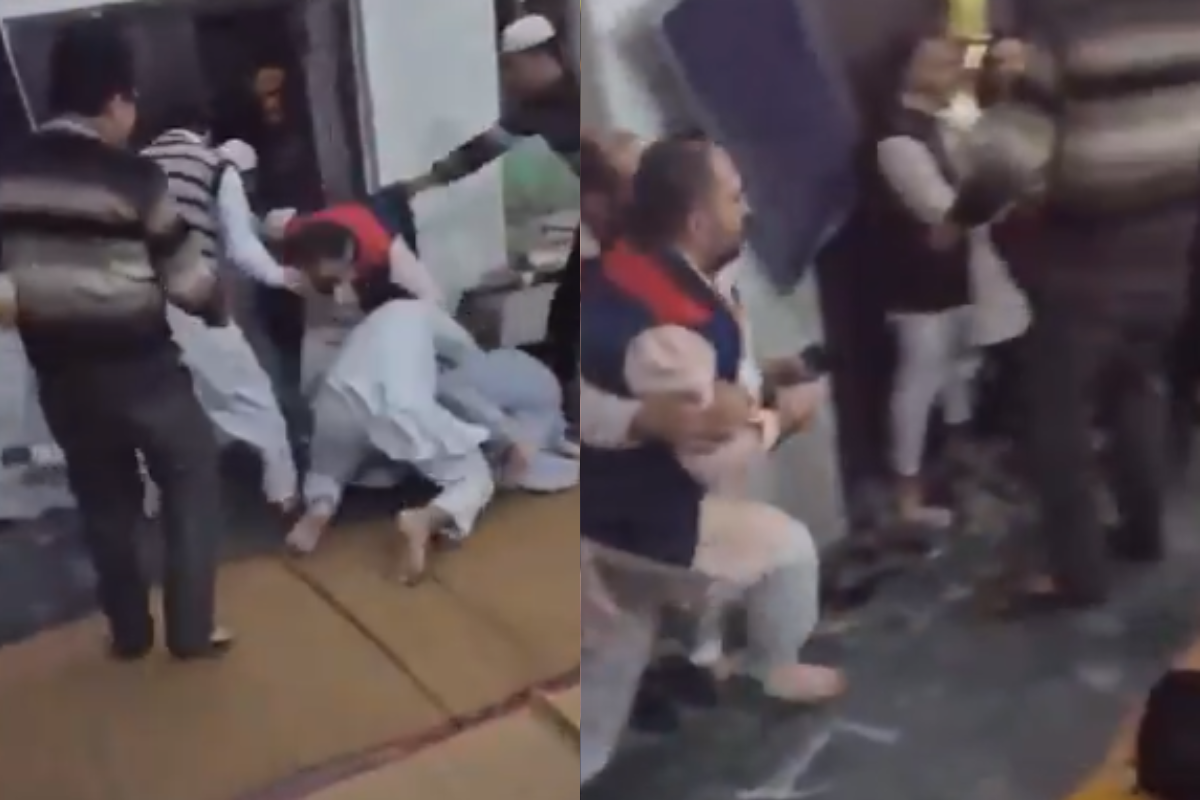 वीडियो में देखा जा सकता है कि पहले हल्की बहस हुई, फिर गुस्सा बढ़ गया। देखते ही देखते लोगों ने एक-दूसरे की कॉलर पकड़ ली। प्लेटें नीचे गिर गईं और लात-घूंसे चलने लगे। जो माहौल कुछ देर पहले तक इबादत का था, वह अचानक कुश्ती के अखाड़े जैसा बन गया। कुर्सियां खिसक गईं और लोग एक-दूसरे को धक्का देते नजर आए।