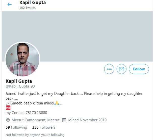 दरअसल, कंकरखेड़ा के नंगलाताशी गांव से 8 नवंबर को एक युवती लापता हुई थी। पुलिस ने आरोपी लड़के के कई परिचितों को पूछताछ के लिए उठाया था। बाद में पता चला कि युवती अपने प्रेमी के पास दुबई पहुंच गई। युवती अपनी मां के स्थान पर एक स्कूल में शिक्षिका थी। कपिल गुप्ता उस युवती के पिता हैं। लाचार पिता ने बेटी की बरामदगी के लिए अब सोशल मीडिया का सहारा लिया है। उन्होंने इसके लिए बाकायदा ट्विटर (Twitter) अकाउंट खोला। इस पर उन्होंने लिखा, अपनी बेटी को वापस पाने के लिए मैंने ट्विटर ज्वाइन किया है...मेरी बेटी को वापस लाने में मेरी मदद करें...एक गरीब पिता की दुआ मिलेगी (Joined Twitter just to get my Daughter back .... Please help in getting my daughter back .... Ek Gareeb baap ki dua milegi)