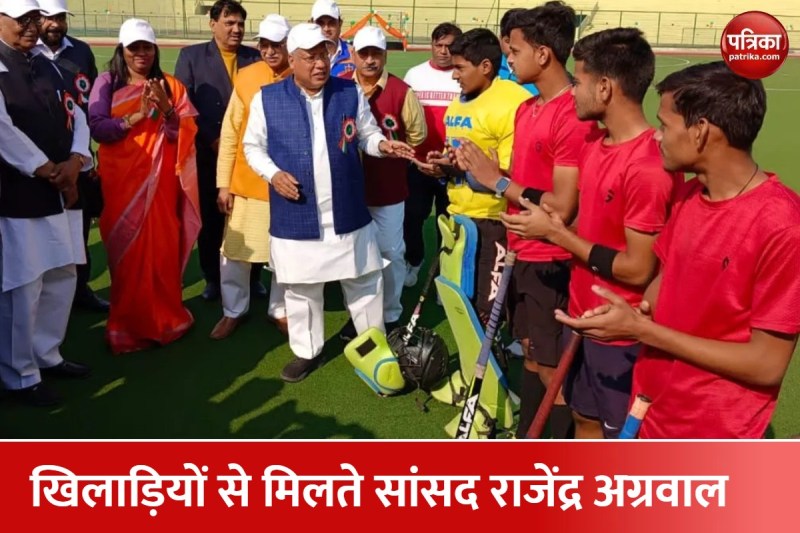 कैलाश प्रकाश स्टेडियम में एस्ट्रोटर्फ हॉकी मैदान का उद्धाटन करने के बाद खिलाड़ियों से मिलते सांसद राजेंद्र अग्रवाल।