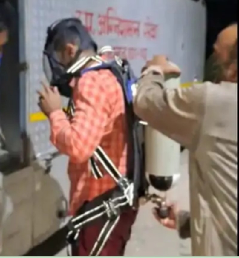 केमिकल रिसाव बंद करने के लिए आक्सीजन का सहारा लेते फायर ब्रिगेड कर्मचारी।