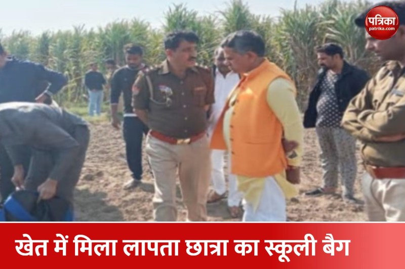 लापता छात्रा का स्कूली बैग खेत में मिलने पर छानबीन करती पुलिस।