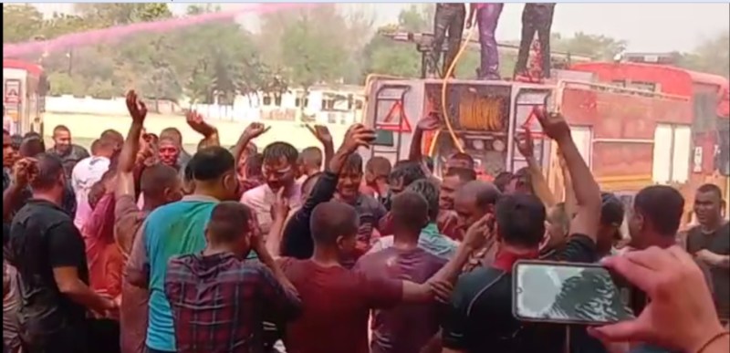 फायर ब्रिगेड की गाड़ी पुलिसकर्मियों पर रंग बरसाती।