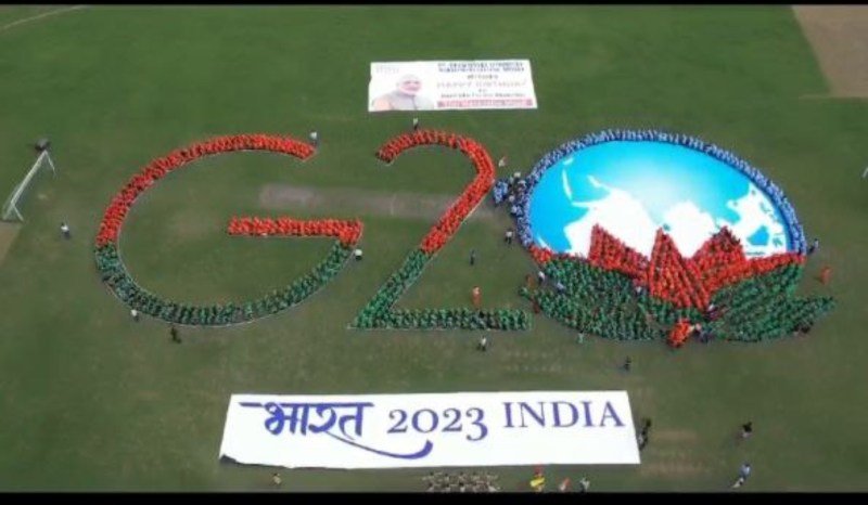 प्रधानमंत्री नरेंद्र मोदी के जन्मदिवस के अवसर पर मेरठ के कैलाश प्रकाश स्टेडियम में छात्र-छात्राओं द्वारा बनाई गई जी-20 मानव श्रृंखला