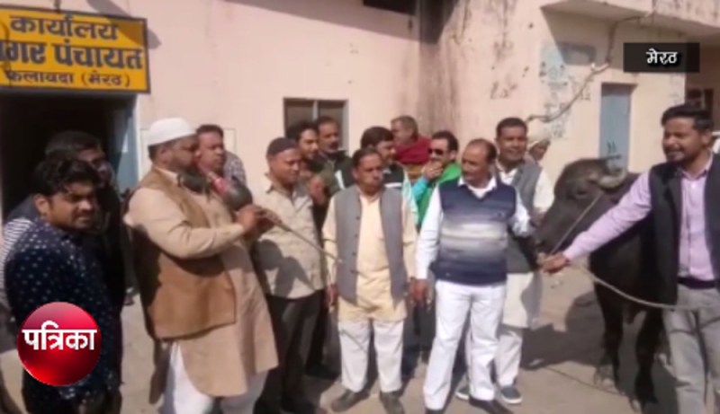 मेरठ। पार्षदों के इस अनोखे प्रदर्शन को देखकर आप हैरान हो जाएंगे। फलावदा नगर पंचायत कार्यालय के भीतर पार्षदों ने भैंस के साथ प्रवेश किया और फिर घंटों उसके आगे बीन बजाते रहे। इस दौरान पार्षदों ने नगर पंचायत ईओ पर गंभीर आरोप भी लगाए। पार्षदों ने ईओ पर भाजपा विधायक संगीत सोम के इशारे पर काम करने का आरोप लगाए। भैंस के आगे बीन बजाने की कहावत तो आप लोगों ने जरूर सुनी होगी, लेकिन मेरठ में आज सभासदों ने इस कहावत को सच कर दिखाया।