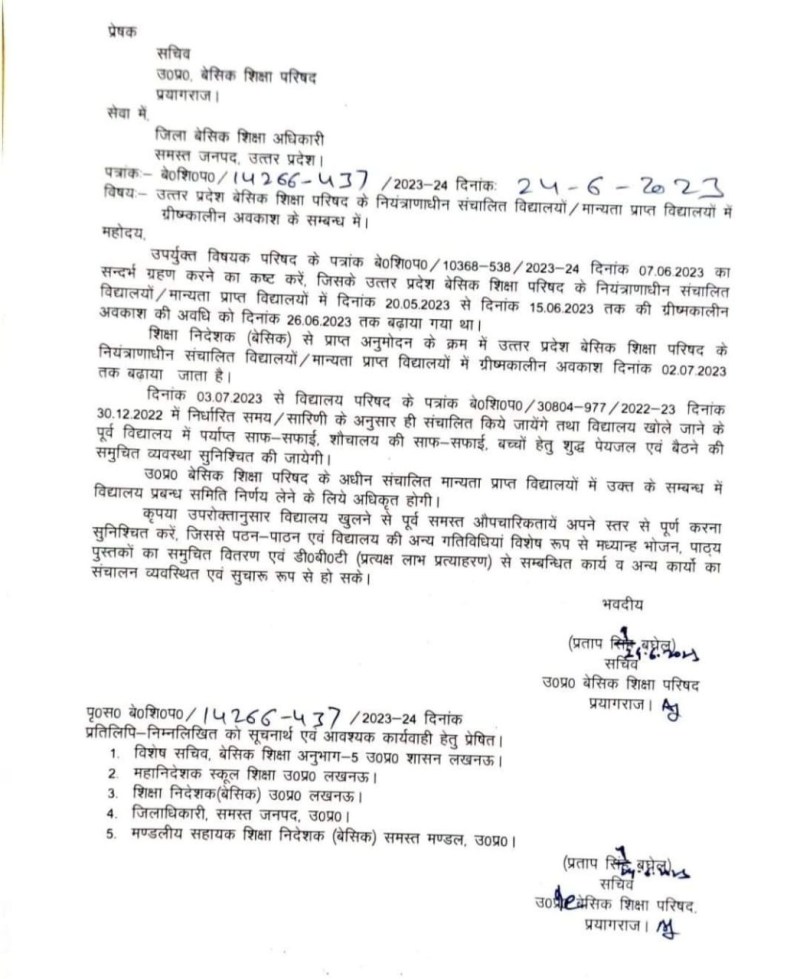 पहले ग्रीष्मकालीन अवकाश की अवधि 26 जून 2023 तक था। अब इसे छह दिनों के लिए और बढ़ाया गया है। इस संबंध में आदेश जारी कर दिया गया है। यह आदेश बेसिक शिक्षा परिषद के अंतर्गत आने वाले सभी स्कूलों में मान्य होगा। पहले बेसिक शिक्षा परिषद के अंतर्गत आने वाले स्कूलों में ग्रीष्मकालीन अवकाश की अवधि 15 जून तक तय की गई थी। जिसे बढ़ाकर 26 जून तक किया गया था।