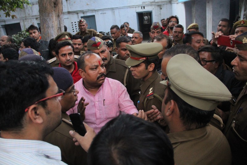 दरअसल, शनिवार को मेरठ में जिस दौरान योगी की रैली हो रही थी। उस समय एक टेम्पो चालक साकेत पर सवारियों को उतार रहा था और वहां पर काफी देर से अपना टैंपो खड़ा किया हुआ था। डयूटी पर तैनात ट्रैफिक पुलिस के टीआई नरेश और सिपाही पुष्पेन्द्र ने ट्रेम्पो चालक से वहां से टैंपो हटाने को कहा और टैंपो के कागज मांगे। इस पर ट्रेम्पो चालक ने घर मोबाइल कर बेटे से टेंपो के कागज लाने को बोला। चालक के बेटे विपिन का आरोप है कि वह कागज लेकर वहां पहुंचा तो पुलिसकर्मियों ने उससे गाली गलौज की। उसने पुलिसकर्मियों को बताया कि वह बजरंग दल का कार्यकर्ता है।