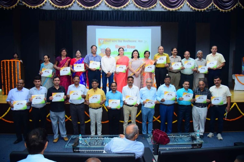 Teacher's Day 2022 in CCSU Meerut शिक्षक दिवस 2022 के अवसर पर आज चौधरी चरण सिंह विश्वविद्यालय परिसर में कार्यक्रमों का आयोजन किया गया। इस मौके पर अधिकांश विभागों में कार्यक्रमों का आयोजन कर डा0 सर्वपल्ली राधाकृष्ण को याद किया गया। चौधरी चरण सिंह विश्वविद्यालय के अप्लाइड साइंस हॉल में आयोजित शिक्षक दिवस के उपलक्ष्य में शिक्षक सम्मान समारोह में कुलपति प्रो॰ संगीत शुक्ला शिक्षक दिवस के मौके पर कहा कि शिक्षक केवल वह नहीं होता जो हमें कक्षा में पढ़ाता है प्रत्येक वह व्यक्ति जिससे हम कुछ ना कुछ सीखते हैं, समझते हैं वह शिक्षक होता है। इस दौरान वीसी संगीता शुक्ला और विवि के शिक्षकों का शिक्षक दिवस 2022 के अवसर पर सम्मान किया गया।