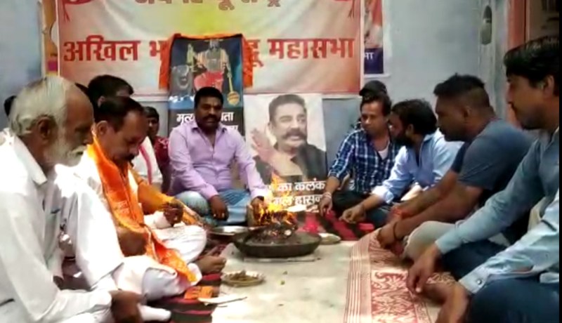 प्रदेश प्रवक्ता अभिषेक अग्रवाल ने कहा कि हम हिन्दू महा सभाइयों ने दोनों गांधी भक्तों की बात मानते हुए आज अपने कार्यालय मेें यह कार्यक्रम रखा। जिसमें सर्वप्रथम यमराज का भव्य विशाल चित्र लगया गया इसके पश्चात यमराज के चित्र पर माल्यार्पण कर फूलमाला अर्पण कर अनुष्ठान कर हवन किया गया। महामंत्रों के उच्चारण बड़े जोरों-शोरों से हुआ, ताकि अधिक से अधिक गांधी भक्त जल्द से जल्द अपने गांधी के पास पहुंच सके। कार्यक्रम के समापन के दौरान कमल हासन के तस्वीरनुमा पुतले को जूते-चप्पलों की माला पहनाकर उसका जुलूस शारदा रोड से निकाला गया। उसके बाद उसमें कालिख पोतकर आग के हवाले कर दिया गया।
