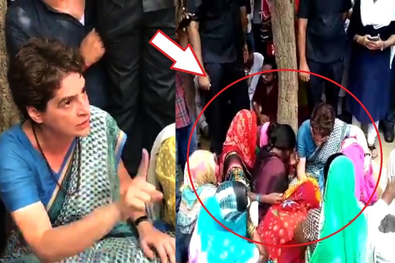 प्रशासन के इस रवैये से नाराज प्रियंका गांधी ने आक्रामक रुख अख्तियार कर लिया और कार्यकर्ताओं का घेरा बनाकर आगे बढ़ने लगीं, कुछ आगे बढीं, उसके बाद एक पेड़ के नीचे धरने पर बैठ गयीं। इस बीच किसी तरह से पीड़ित परिवार की कुछ और महिलाएं वहां उनसे मिलने पहुंचीं। प्रियंका से मिलकर वह फफक पड़ीं। रोते-रोते महिलाओं ने प्रियंका गांधी को उस दिन की दहशत और खौफ की दास्तान सुनायी। महिलाएं प्रियंका की गोद में सर रखकर रोती रहीं और प्रियंका उनके आंसू पोंछती रहीं। उन्होंने पीड़ित महिलाओं को गले से लगाकर उन्हें ढाढस बंधाया।