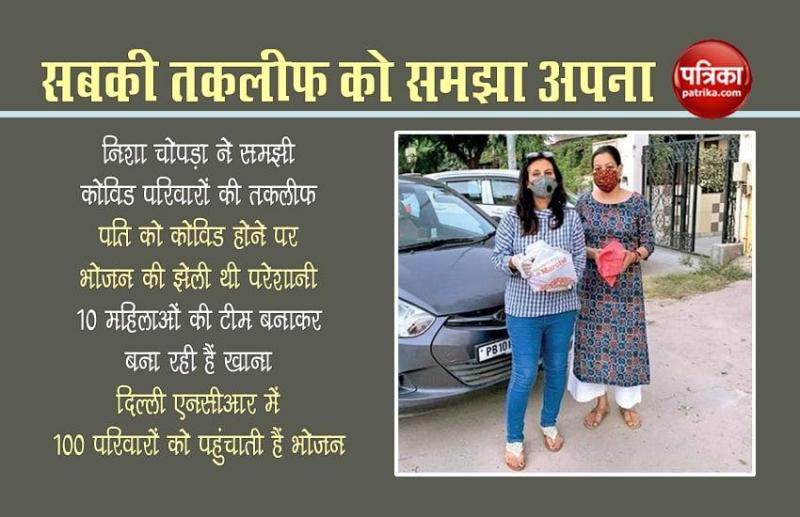 दिल्ली की रहने वाली निशा चोपड़ा दिल्ली एनसीआर में ऐसे घरों को खाना पहुंचाने में मदद कर रही हैं, जो कोविड से ग्रस्त हैं। जो लोग घरों से बाहर नहीं जा सकते हैं और जिन्हें भोजन के लिए संघर्ष करना पड़ रहा है।