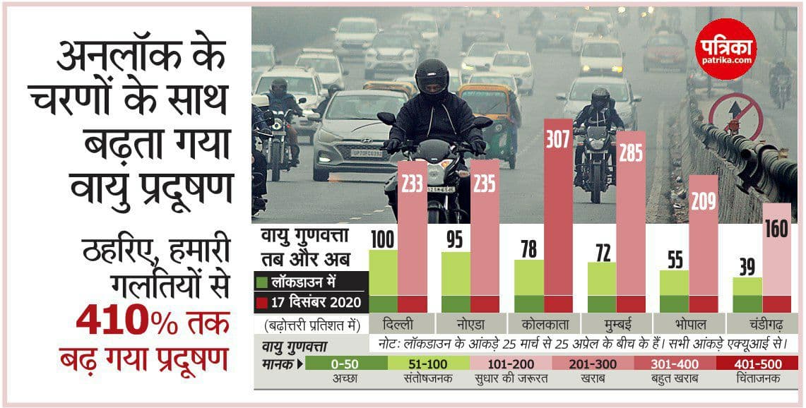 सबसे महत्वपूर्ण पहलू यह है कि लॉकडाउन के दौरान पूरे देश की हवा में सुधार हुआ था, लेकिन गुरुवार के आंकड़ों से तुलना करें तो देश के प्रमुख शहरों की एयर क्वालिटी इंडेक्स में 150 से 400 फीसदी तक की बढ़त देखी गई है। जो स्वास्थ्य की दृष्टि से बेहद खतरनाक है।