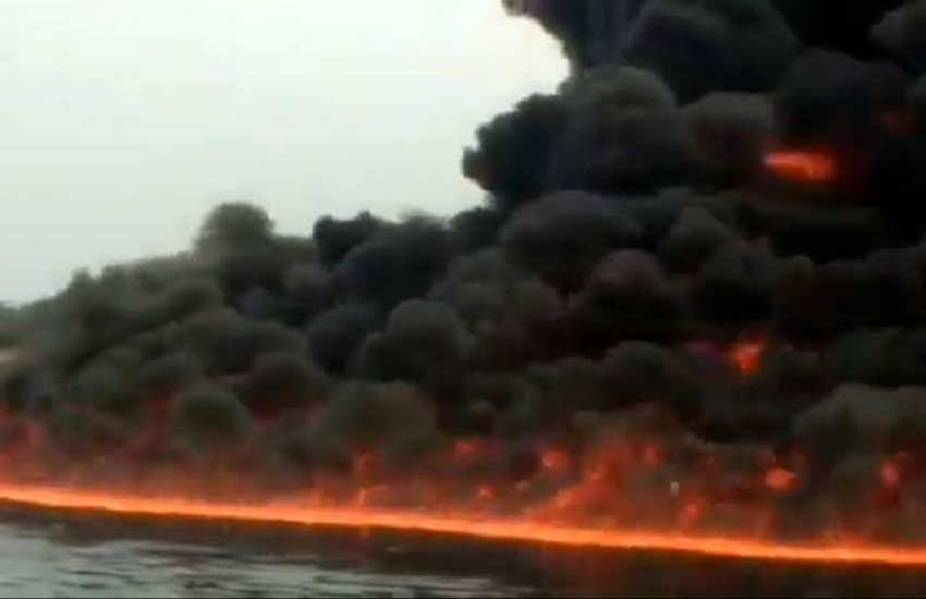 दरअसल, पाइप लाइन फटने की वजह से पूरा तेज पानी की सतह पर फैल गया, जिससे उसमे आग लग गई।