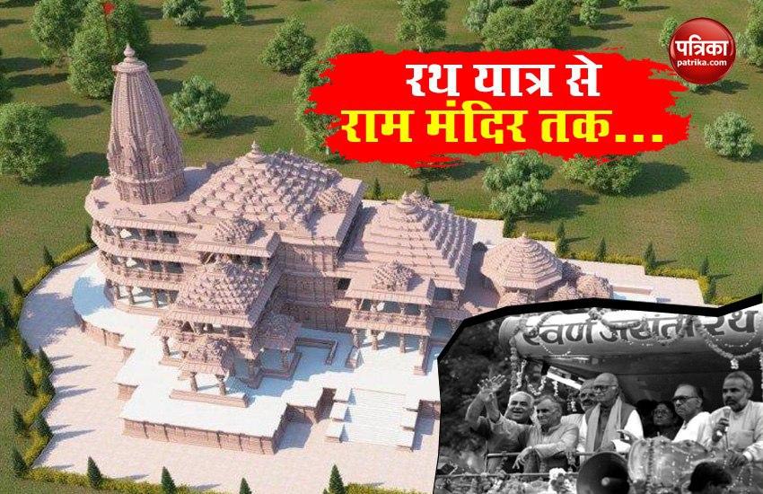 रिपोर्ट के मुताबिक, पहले लालकृष्ण आडवाणी पैदल यात्रा निकालने की योजना बना रहे थे। लेकिन, बीजेपी के दिवंगत नेता और तत्कालीन पार्टी महासचिव प्रमोद महाजन ( Pramod Mahajan) ने रथ यात्र निकालने की सलाह दी थी। इसके बाद ही तय हुआ कि 10 हजार किलोमीटर रथ यात्र ( BJP Rath Yatra) निकलेगी। इस रथ यात्रा का मकसद था कि बीजेपी लोगों को यह भरोसा दिलाना चाहती थी कि उनकी पार्टी अयोध्या में राम मंदिर का दोबारा निर्माण करेगी। यह रथ यात्रा 5 सितंबर 1990 से शुरू होकर 30 अक्टूबर चलनी थी। इस रथ यात्रा में लालकृष्ण आडवाणी, मुरली मनोहर जोशी, प्रमोद महाजन और नरेंद्र मोदी शामिल थे। यहीं से नरेन्द्र मोदी बीजेपी केन्द्रीय नेतृत्व की नजर में भी आए। बिहार (Bihar) के समस्तीपुर ( Samastipur) जिले में लालू प्रसाद यादव (Lalu Prasad Yadav) ने 23 अक्टूबर 1990 को रथ यात्रा रोक दी। साथ ही लालकृष्ण आडवाणी की गिरफ्तारी भी हुई थी परिणाम ये है कि केन्द्र में वीपी सिंह (V P Singh) की सरकार तक गिर गई। इसके बाद से राम मंदिर बीजेपी क मुख्य एजेंडा बन गया। गुजरात में भी इस मुद्दे को बीजेपी ने भुनाया और 26 में से 12 लोकसभा सीट पर पार्टी ने जीत दर्ज की। 2014 के लोकसभा चुनाव (Lok Sabha Chunav) में भी बीजेपी ने इस मुद्दे को जमकर भुनाया और पार्टी ने 282 लोकसभा सीटों पर जीत दर्ज की। 2017 यूपी विधानसभा चुनाव में भी इस मुद्दे को उछाला गया और बीजेपी को 403 में से 312 सीटों पर जीत मिली। वहीं, 2019 लोकसभा चुनाव में भी यह मुद्दा उछला और 303 सीटों पर बीजेपी को जीत मिली। राम मंदिर (Ram Mandir) का मामला सुप्रीम कोर्ट पहुंचा 9 नवंबर, 2019 को सुप्रीम कोर्ट ने राम मंदिर के पक्ष में ऐतिहासिक फैसला सुनाया। फरवरी, 2020 में मोदी सरकार ने राम मंदिर ट्रस्ट की घोषणा की और आज इसका आधारशिला रखा जाएगा।