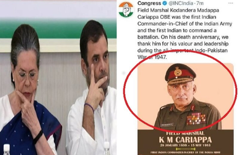 नई दिल्ली। देश के पहले आर्मी चीफ को कोडंडेरा मडप्पा करिअप्पा (Field Marshal Kodandera Madappa Cariappa) की आज पुण्यतिथि है। करिअप्पा का जन्म 28 जनवरी, 1899 को कर्नाटक में हुआ था। 94 वर्ष की उम्र में 15 मई, 1993 को बेंगलुरू में उन्होंने अंतिम सांस ली। उनकी पुण्यतिथि के मौके पर शनिवार सुबह से देशभर में लोग श्रद्धांजलि दे रहे है। इसी कड़ी में कांग्रेस पार्टी ने भी देश के पहले आर्मी चीफ को श्रद्धांजलि दी। लेकिन ट्वीट करते समय कांग्रेस पार्टी से एक बहुत बड़ी गलती हो गई। जिसके कारण सोशल मीडिया पर कांग्रेस की काफी निंदा हो रही है। हालांकि कांग्रेस ने अपनी पोस्ट को हटा दिया। लेकिन तब तक काफी देर हो चुकी थी। इससे पहले ट्विटर यूजर ने पोस्ट का स्क्रीनशॉट लेकर कांग्रेस पार्टी को काफी खरी-खोटी सुनाई शुरू कर दिया।