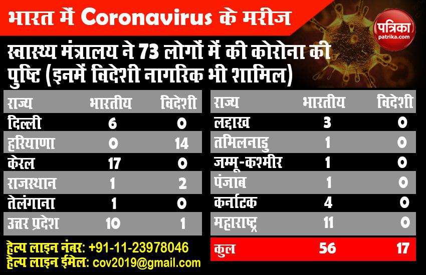 स्वास्थ्य मंत्रालय ने 73 लोगों में की कोरोना के संक्रमण की पुष्टि की है ( इनसें विदेशी नागरीक भी शामिल )