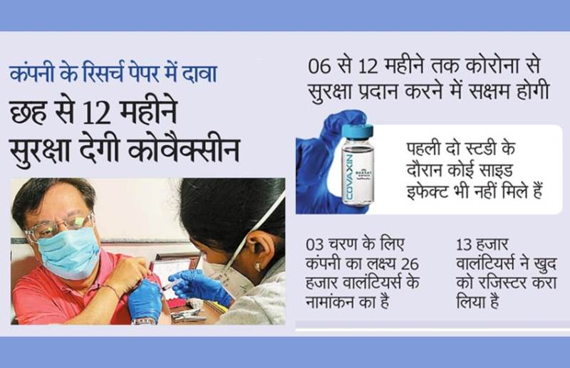 नई दिल्ली। देश में निर्मित कोवैक्सीन को लेकर दावा किया जा रहा है कि वह छह से 12 महीने तक कोरोना से सुरक्षा प्रदान करने में सक्षम होगी। इसके अभी तक के ट्रायल में किसी भी तरह का साइड इफैक्ट नहीं आया है। यह दावा खुद वैक्सीन बनाने वाली भारत बायोटेक ने किया है। कोवैक्सीन ने पहले चरण के प्रतिभागियों को टीका लगाए जाने के तीन महीने बाद लंबे समय तक बने रहने वाली एंटीबॉडी और टी-सेल प्रतिरोधक प्रतिक्रिया को दिखाया। हालांकि एफिकेसी रेट के बारे में कहा गया है कि तीसरे चरण का ट्रायल पूरा होने के बाद इसके बारे में खुलासा किया जाएगा।
