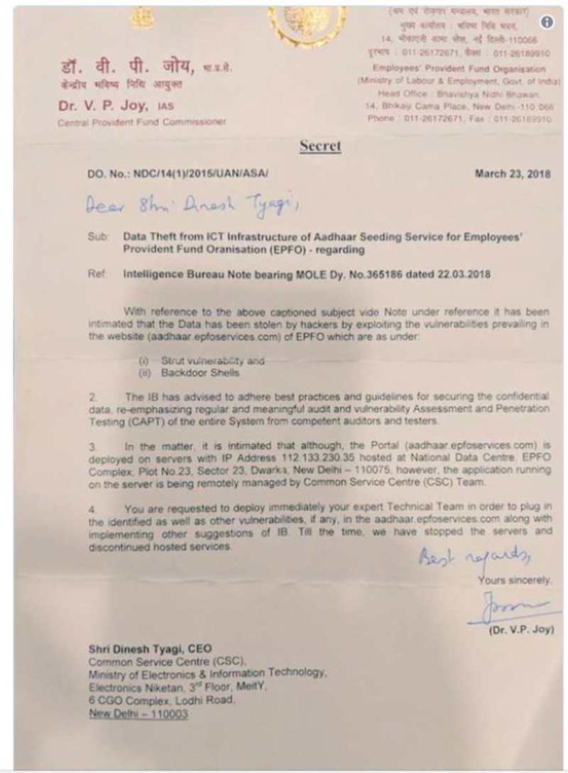 केंद्रीय प्रोविडेंट फंड आयुक्त डॉ वी पी जॉय की चिठ्ठी में लिखा गया है कि आईबी ने इस संबंध में पहले ही आदेश दे दिए थे कि डाटा की सुरक्षा के लिए नियमित ऑडिट और समय-समय पर टेस्टिंग करवाई जानी चाहिए। आयुक्त ने मंत्रालय को इस समस्या को दूर करने के लिए तकनीकी विशेषज्ञों की टीम तैनात करने के लिए कहा है। पत्र में 'सीक्रेट' यानी गोपनीय शीर्षक लगा हुआ है। दिल्ली की कॉमन सर्विस टीम को भी पत्र दिया गया है। आयुक्त ने चिठ्ठी में कहा है कि अभी वेबसाइट का सर्वर और इससे जुड़ी दूसरी सेवाओं को रोक दिया गया है।