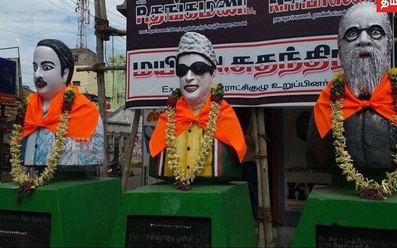 घटना तमिलनाडु के नमक्कल जिले की है, जहां राज्य के दो पूर्व मुख्यमंत्री सीएन अन्नादुरई और एमजी रामचंद्रन के साथ-साथ समाज सुधारक रामासामी पेरियार की मूर्तियों को भगवा कपड़े पहनाए गए हैं। तस्वीर में देखा जा सकता है कि तीनों मूर्तियां पास-पास हैं, तीनों मूर्तियों के गले में किसी ने भगवा रंग का कपड़ा बांध दिया। इस घटना की जानकारी पुलिस को दे दी गई है और पुलिस ने मामले की जांच भी शुरू कर दी है। फिलाहल पुलिस को इस मामले में कोई कामयाबी नहीं मिली है कि आखिर ये हरकत किन लोगों की तरफ से की गई है।