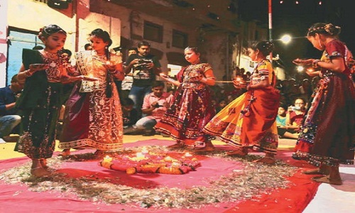 जी, हां यहां नवरात्रि के अष्टमी में 11 से 14 वर्ष की लड़कियां गरबा करती है लेकिन ये कम उम्र की लड़कियां गरबा खेलने के लिए पैरों के नीचे कांच के टुकड़े बिछा देती हैं और सिर्फ इतना ही नहीं ये बच्चियां अपने हाथों में जलता हुआ दीपक भी लेती है।