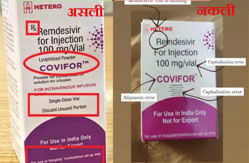 असली रेमडेसिविर इंजेक्शन के पैकेट पर सबसे नीचे की तरफ 'For use in' कैपिटल लेटर में होता है जबकि नकली के डिब्बे पर इसे फिर स्मॉल लेटर्स में लिखा गया है। इससे भी नकली को पहचान सकते हैं।