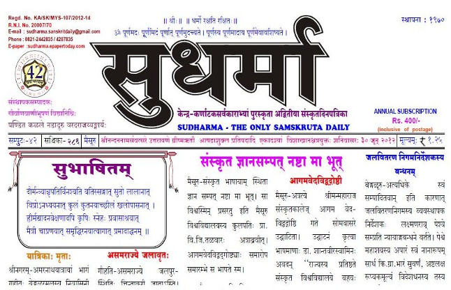 मैसूर। दुनिया का एक मात्र संस्कृत दैनिक सुधर्मा अपनी अंतिम सांसे गिन रहा है। एक महीने बाद यह अखबार अपनी स्थापना के 46 साल पूरे करने वाला है लेकिन हालत यह है कि वह शायद ही एक महीने और चल पाए। राजनीति योग, वेद और संस्कृति सहित विभिन्न खबरें देने वाले इस अखबार का सर्कुलेशन महज चार हजार है।