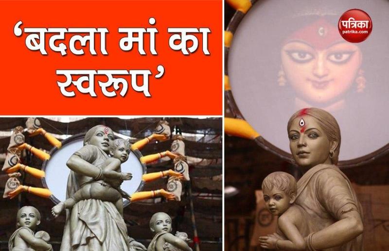 नई दिल्ली। देश में जारी कोरोना वायरस ( coronavirsu ) संकट के बीच आज से नवरात्रि ( Navratri 2020 ) का आगाज हो गया है। हिन्दू धर्म में दुर्गा पूजा ( Durga Puja ) का खासा महत्व है। इस दौरान जगह-जगह पर मां दुर्गा की प्रतिमा लगाई जाती है। कई जगहों पर भव्य पंडाल ( Durga Pandal ) बनाया और सजाया जाता है, जिसे देखने के लिए दूर-दूर से लोग आते हैं। खासकर, कोलाकाता दुर्गा पंडाल ( kolkata Durga Pandal ) का पूरी दुनिया में नाम है। हर साल यहां के पंडालों की चर्चाएं होती है और अलग-अलग राज्यों और विदेशों से कोलकाता के पंडालों को देखने के लिए लोग पहुंचते हैं। यहां के पंडालों में मां दुर्गा की भव्य प्रतिमाएं बनाई जाती है। अलग-अलग अंदाज में मां के स्वरूप को दिखाया जाता है। लेकिन, इस साल एक पंडाल में मां दुर्गा के अलग रूप को दिखाया गया है, जो चर्चा का विषय बना हुआ है।