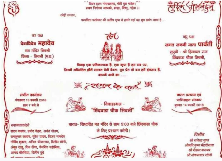 बता दें कि ये खास शादी का कार्ड पूरे शहर में लोगों को बांटा जा रहा है। लेकिन जब लोग शादी का कार्ड खोलकर दूल्हा-दूल्हन का नाम देख रहे हैं तो उनके होश उड़ जा रहे हैं। लेकिन बवाल सिर्फ इतना ही नहीं है, आपको जानकर हैरानी होगी कि कार्ड में शादी को लेकर सभी जानकारियां भी पौराणिक टाइप की दी गई हैं। शादी 14 फरवरी की बताई जा रही है। इसी दिन महाशिवरात्रि भी है, इसके साथ ही वैलेंटाइन डे भी है। जबकि भगवान शिव और मां पार्वती की शादी का संगीत समारोह 13 फरवरी की शाम 7 बजे किया जाएगा।