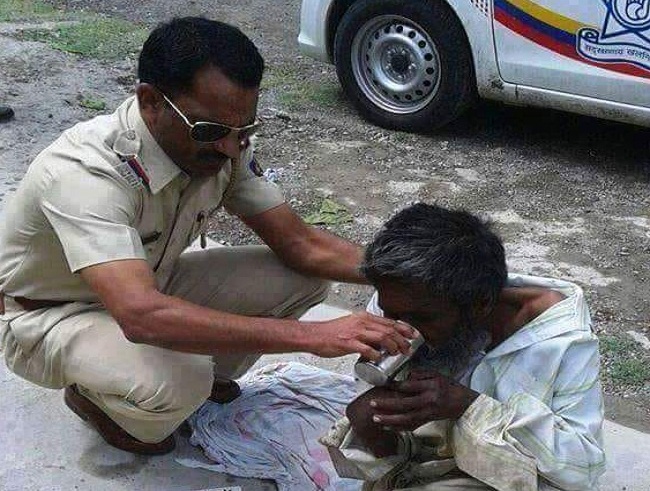 सोशल मीडिया साइट फेसबुक पर इन दिनों एक फोटो वायरल हो रही है, जिसे काफी तेज़ी से शेयर भी किया जा रहा है। बता दें कि सोशल मीडिया पर वायरल इस फोटो में महाराष्ट्र पुलिस का एक जवान सड़क पर बैठे गरीब, लाचार और भूखे बुज़ुर्ग व्यक्ति को खाना खिला रहा है। इतना ही नहीं महाराष्ट्र पुलिस का ये जवान बुज़ुर्ग व्यक्ति को अपने हाथ से ही पानी भी पिला रहा है। फोटो में आप देखेंगे कि वहां एक अखबार पर रोटी और थोड़ी सब्ज़ी रखी हुई है। यदि आप थोड़ा सा ध्यान देंगे तो मालूम चलेगा कि वहां हैलो अमरावती नाम का अखबार है। जिससे ये साफ हो जाता है कि यह तस्वीर महाराष्ट्र के अमरावती की है।