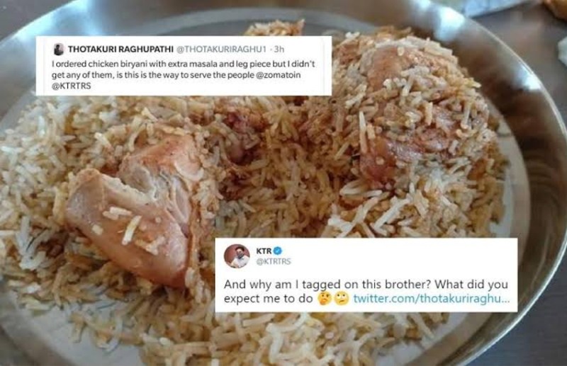 दरअसल, तेलंगाना के नगर प्रशासन और शहरी विकास मंत्री केटी रामाराव यानी केटीआर ट्विटर पर बेहद लोकप्रिय हैं। जो भी उनसे मदद की गुहार लगते है वे उनको कभी भी निराश नहीं करते है। कोरोना के इस संकट के समय लॉकडाउन के बीच उन्होंने लोगों को मेडिकल सुविधा और ई-पास के भी इंतजाम कराए। हाल ही में एक रघुपति नाम के एक युवक ने चिकन बिरानी का ऑनलाइन ऑर्डर किया। लेकिन खाने लगा तो बिरयानी में लेग पीस का नहीं मिलना। इसके बाद उन्होंने ट्विटर पर केटीआर को शिकायत कर डाली।