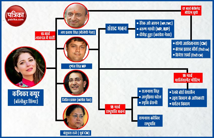 बॉलीवुड गायिका कनिका कपूर का कोविड-19 परीक्षण पॉजिटिव निकला है। जैसे ही यह खबर सामने आई, भाजपा नेता और राजस्थान की पूर्व मुख्यमंत्री वसुंधरा राजे सिंधिया और उनके सांसद बेटे दुष्यंत सिंह ने अपने आपको अलग-थलग कर लिया है। दोनों ने कोरोना वायरस से पीड़ित गायिका कनिका कपूर के साथ एक पार्टी में शिरकत की थी।