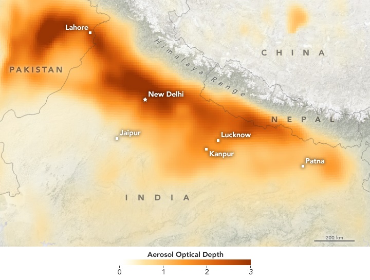 नासा की एक दूसरी तस्वीर में एरोसोल ऑप्टिकल डेप्थ यानी हवा में प्रदूषण के कणों को दिखाया जा रहा है। इस तस्वीर में प्रदूषण को चार भागों में बांटा गया है। जिसमें दिल्ली को सबसे ज्यादा स्मॉग वाला बताया गया है। इसके बाद लखनऊ में स्मॉग दिखाई दे रहा है। फिर क्रमश: जयपुर , कानपुर और पटना भी स्मॉग की चपेट में हैं। पड़ोसी मुल्क पाकिस्तान भी स्मॉग से अछूता नहीं है। लाहौर और आसपास के इलाको में घना स्मॉग है।