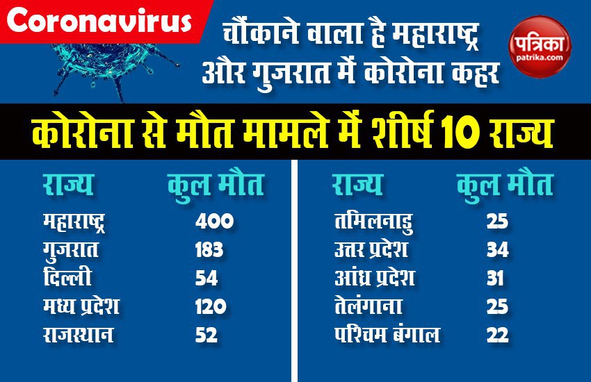 मंगलवार को महाराष्ट्र और गुजरात से कोरोना वायरस से मरने वालों की संख्या 50 से अधिक है। हेल्थ मिनिस्ट्री के साइट के मुताबिक अभी तक देशभर में कुल मौतों की संख्या 1007 है। यानि दोनों राज्यों की कुल मौतों में हिस्सेदारी 60 प्रतिशत की होने वाली हैं। यह केंद्र और प्रदेश दोनों सरकारों के लिए गंभीर चिंता का विषय है।