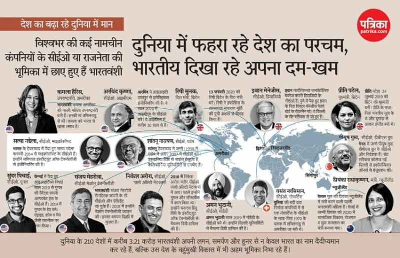 नई दिल्ली। विश्व पटल पर नक्षत्र बन चुके भारतवंशियों ( Indians ) के नामों की फेहरिस्त बहुत लंबी है। राजनीति, अर्थशास्त्र, आइटी, स्वास्थ्य, शिक्षा, मनोरंजन जैसे क्षेत्रों में इनके हुनर का हौसला बुलंद है। दुनिया के 210 देशों में करीब 3.21 करोड़ भारतवंशी अपनी लगन, समर्पण और हुनर से न केवल भारत का नाम दैदीप्यमान कर रहे हैं, बल्कि उस देश के चहुंमुखी विकास में भी अहम भूमिका निभा रहे हैं।