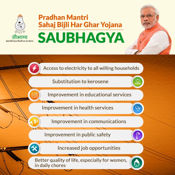 नई दिल्ली। प्रधानमंत्री नरेंद्र मोदी ने हर घर तक बिजली पहुंचाने के लिए सौभाग्य योजना को लांच किया है। इस योजना की जानकारी पीएम मोदी ने ट्वीट कर लोगों को दी। योजना की लांचिंग के साथ पीएम मोदी ने दीनदयाल ऊर्जा भवन का लोकार्पण किया। आइए आपको बताते हैं कि इस योजना से आपको क्या फायदे होंगे-