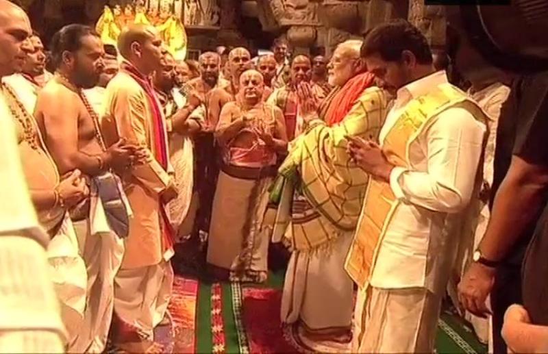 पीएम मोदी तिरुपति बालाजी मंदिर पहुंचे। यहां मौजूद पूजारियों ने प्रधानमंत्री का स्वागत किया। मोदी ने मंदिर में पूजा-अर्चना की। इस दौरान उनके साथ सीएम जगन मोहन रेड्डी भी मौजूद थे।
