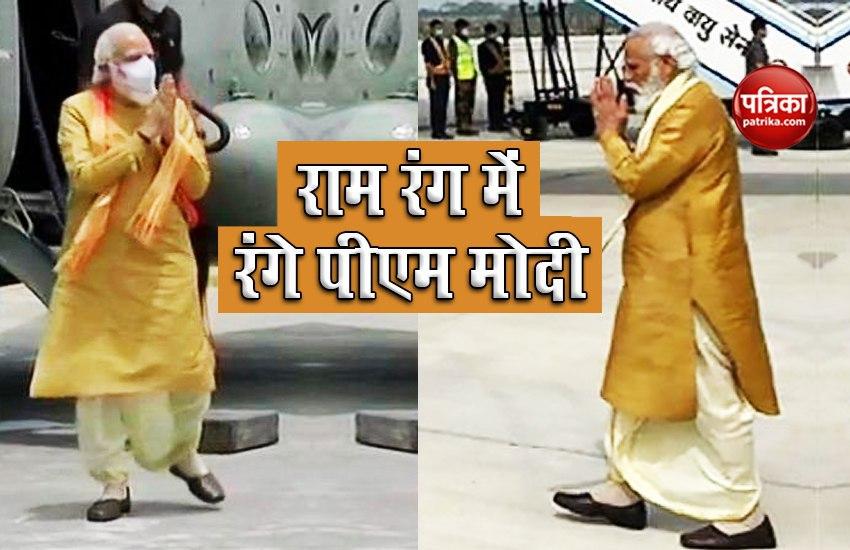 नई दिल्ली। लंबे इंतजार के बाद अयोध्या ( Ayodhya ) में भव्य राम मंदिर ( Ram Mandir Bhoomi Poojan ) की नींव आज रखने जा रही है। इस ऐतिहास पल का गवाह पूरा देश बनेगा। प्रधानमंत्री नरेंद्र मोदी ( PM Narendra Modi ) मंदिर निर्माण से पहले भूमि पूजन के कार्यक्रम में शामिल होने के लिए दिल्ली ( Delhi ) से रवाना हुए। इस दौरान पीएम मोदी खास अंदाज में नजर आए।