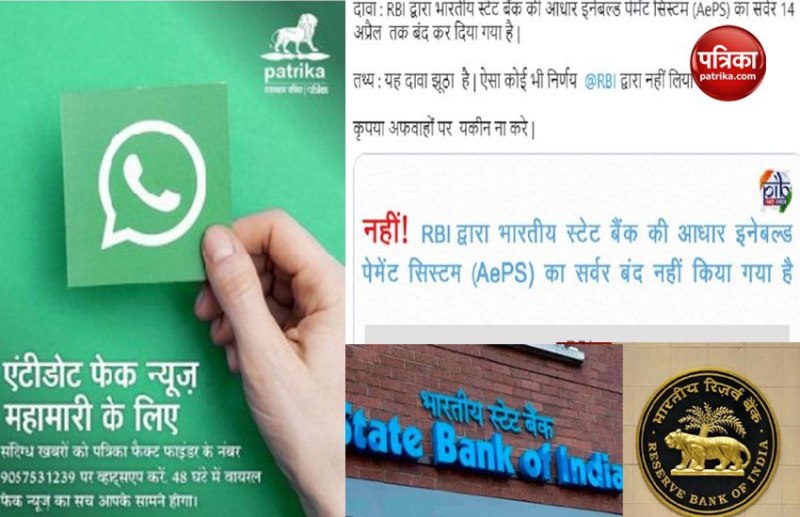 नई दिल्ली। कोरोना वायरस की रोकथाम को लेकर 21 दिनों का देशव्यापी लॉकडाउन लागू है। लेकिन आवश्यक चीज़ें और बैंकिंग सेवाएं चालू हैं। लोग ऑनलाइन और ऑफ लाइन के जरिए बैंकिंग सुविधाएं प्राप्त कर रहे हैं। इधर सोशल मीडिया पर एक मैसेज तेजी से शेयर किया जा रहा है। जिसमें दावा किया जा रहा है कि रिजर्व बैंक ऑफ इंडिया (RBI) ने स्टेट बैंक का आधार इनेबल्ड पेमेंट सिस्टम (AePS) सर्वर बंद कर दिया है। 14 अप्रैल तक स्थायी रूप से इसे बंद करने का आदेश जारी किया गया है।