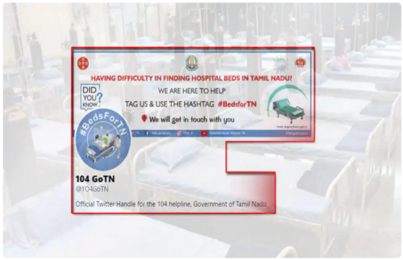 बता दें कि तमिलनाडु स्वास्थ्य विभाग ने कोरोना मरीजों के लिए बिस्तर की सुविधा प्राप्त करने के लिए एक ट्विटर अकाउंट @1O4GoTN लॉंच किया है। इस अकाउंट के जरिए कोरोना मरीज अस्पतालों में बेड के लिए अनुरोध कर सकते हैं। यह बताया गया है कि कोरोना मरीजों के अनुरोध को अंजाम तक पहुंचाने के लिए एक एकीकृत कमांड सेंटर स्थापित किया जाएगा।